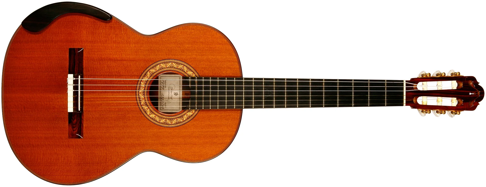 Dieter Hopf is one of those extraordinary luthiers who is always trying to push the boundaries of guitar building both in the materials he used and in the design. Here we have a 1977 that features some bold and eye-catching Macassar Ebony for the back and sides as well an armrest to help the top resonate more freely. The tone is robustly dark and matches the coloring of the rich cedar top.